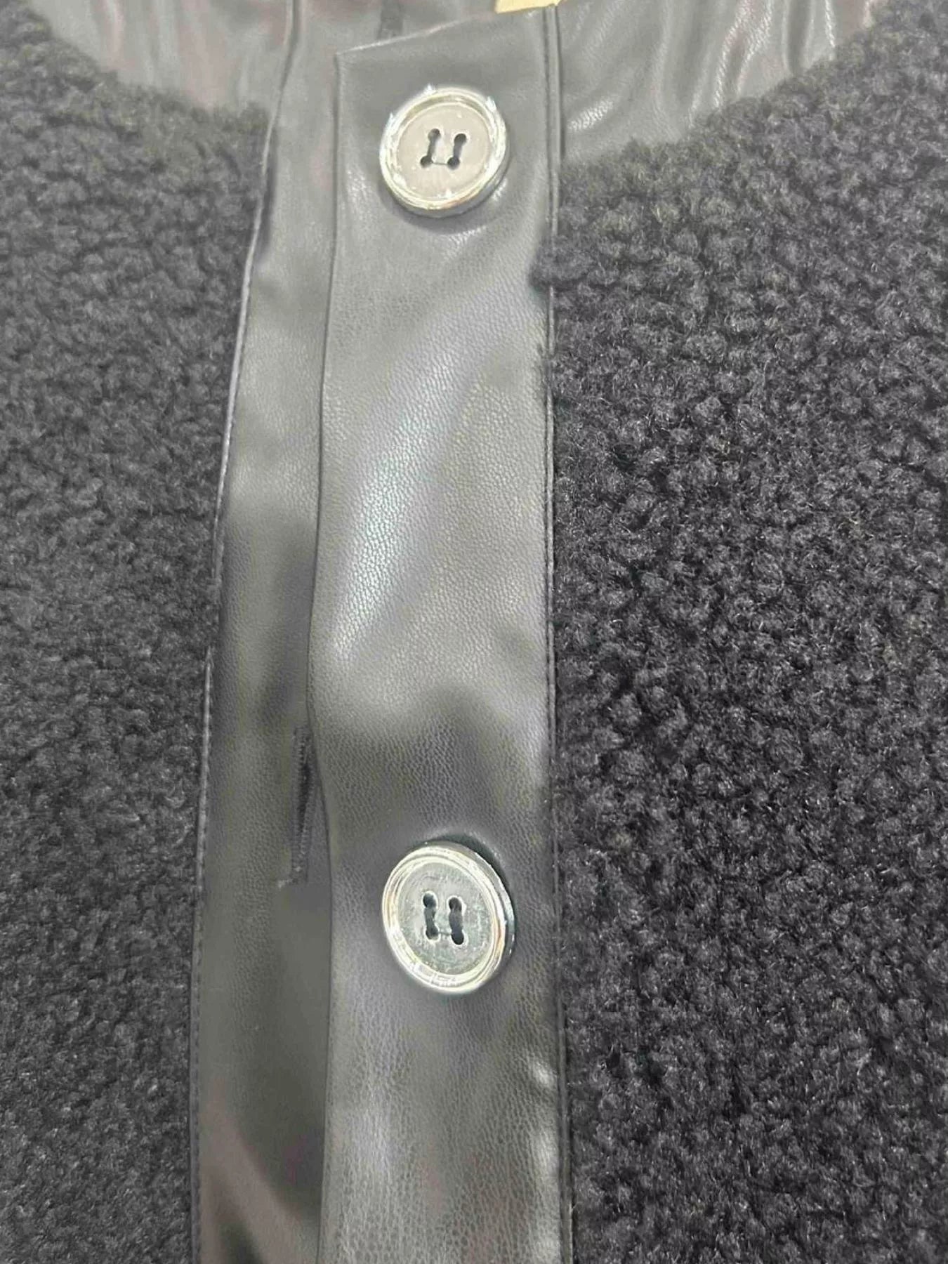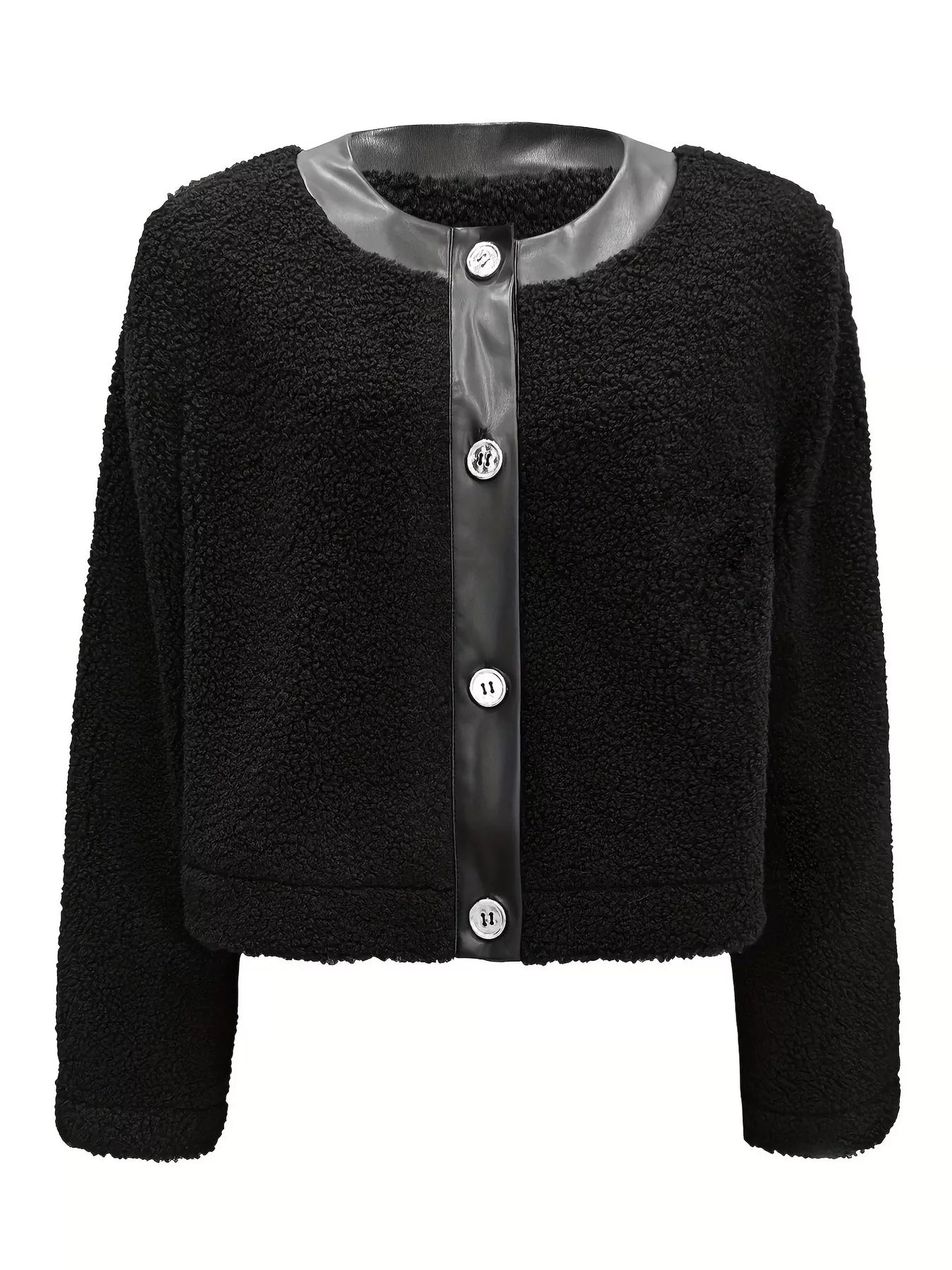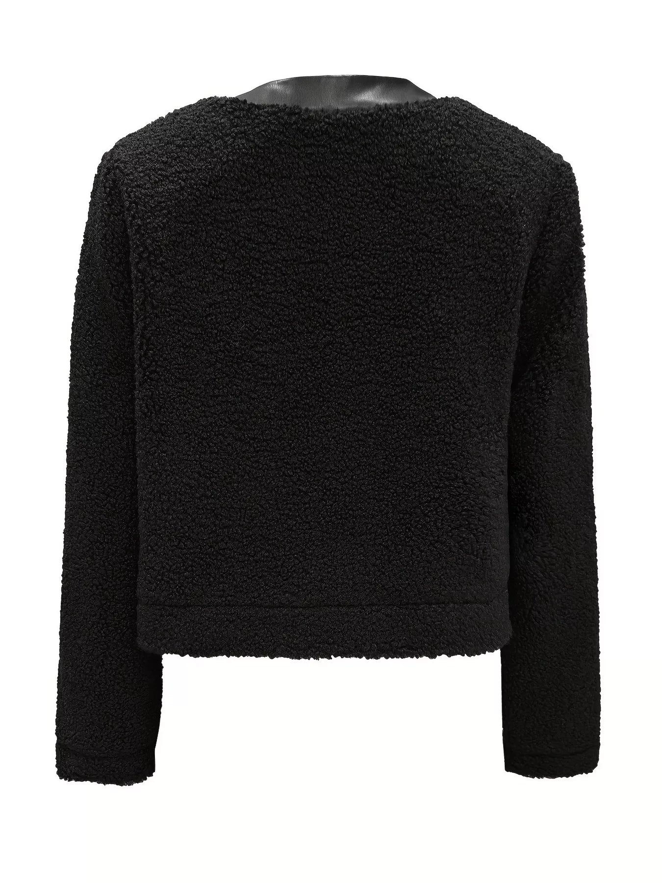 Meet your throw-on statement layer: a thick, teddy-soft bouclé jacket elevated with a sleek faux-leather neckline and placket. The boxy, cropped cut slips over tees and knits without bulk—so you stay cozy and look instantly put-together from coffee runs to dinner plans.